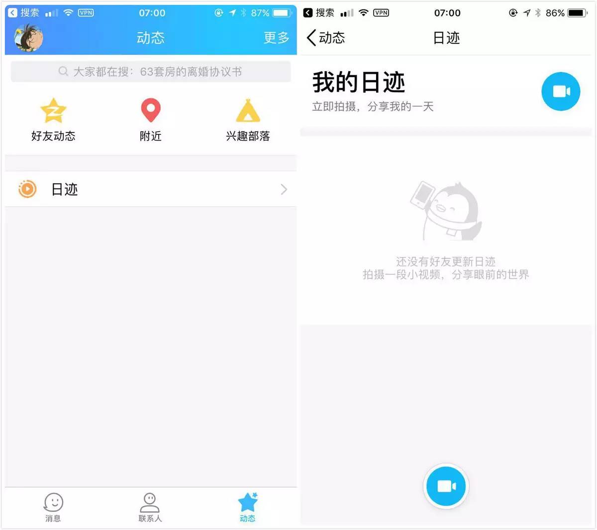 再仔细数数,QIM 底部的入口就三项,聊天、相机以及日迹——也就是 QQ 自己的短视频入口。