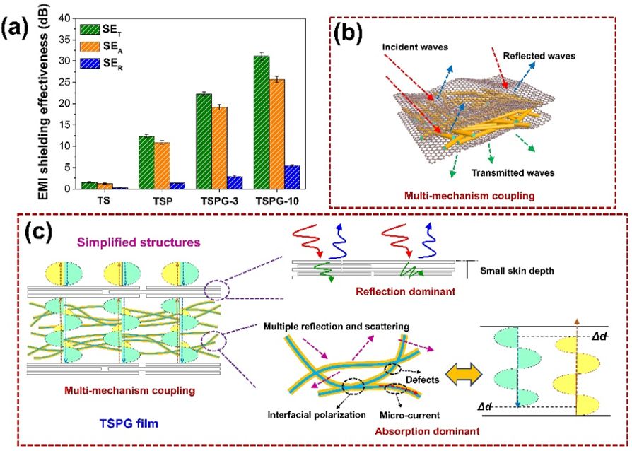图2 (a)复合薄膜电磁屏蔽性能分析。(b-c)复合薄膜电磁屏蔽机理分析。