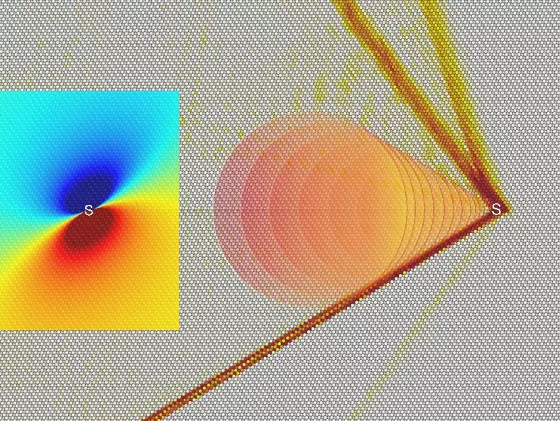 图:各向异性晶体铜中超声速螺位错所产生的主要剪应力场(左侧)以及其在超声速运动时,突破三个剪切波过程中产生的马赫锥