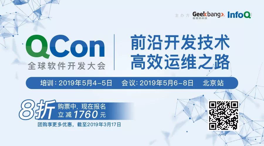 服务器和流量规模爆发式增长的时代,如何提升运维效率、降低开发成本?2019 年 5 月 6-8 日,QCon 邀您相约北京国际会议中心,共探运维领域最佳落地实践。点击 「 阅读原文 」或识别二维码了解 QCon 十周年精心策划,现在购票即享 8 折限时折扣,立减 1760 元,团购还有更多优惠!有任何问题欢迎联系票务小姐姐 Ring:电话 010-53935761,微信 qcon-0410