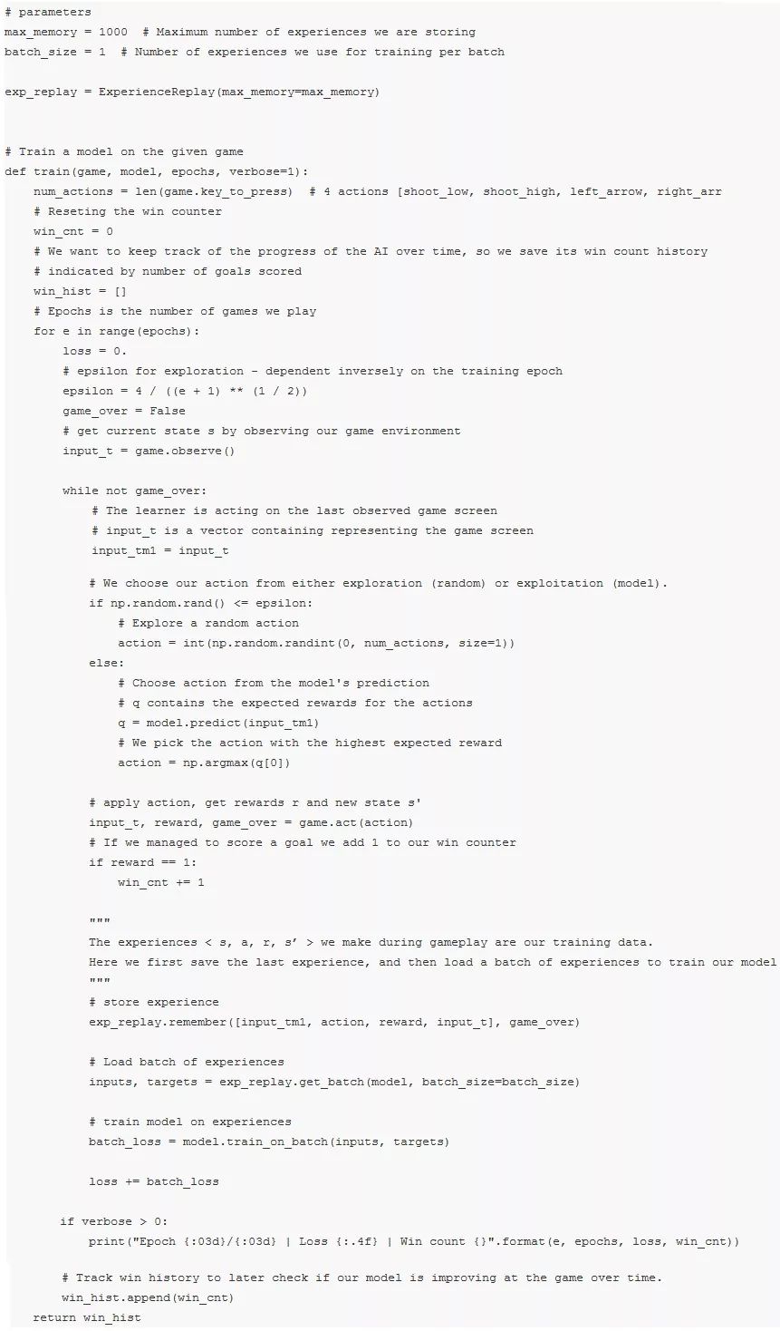 现在我们可以与游戏互动,并将互动储存在记忆中。我们开始训练 Q 学习模型。为此,我们将在「探索」(exploration,在游戏中随机采取动作)和「利用」(exploitation,采取模型预测的动作)之间取得平衡。这样我们就可以通过试错来获得不同的游戏体验。参数 epsilon 正是用于此目的,它是平衡 exploration 和 exploitation 的指数递减因子。开始的时候,我们什么都不知道,想进行更多探索,但是随着 epoch 的增加,我们学到的越来越多,于是我们想多利用,少探索。因此参数epsilon 的值衰减。