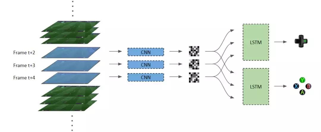 现在理解了图像之后,我们继续来决定下一步的行动。然而,我们并不想仅看完一个帧的图像就采取动作。我们首先需要观察这些图像的短序列。这正是 LSTM 发挥作用的地方,LSTM 就是因其对时序数据的优越建模能力而出名的。连续的图像帧在序列中作为时间步,每个帧使用 CNN 模型来提取特征图。然后这些特征图被同时馈送到两个 LSTM 网络。