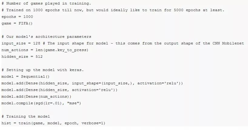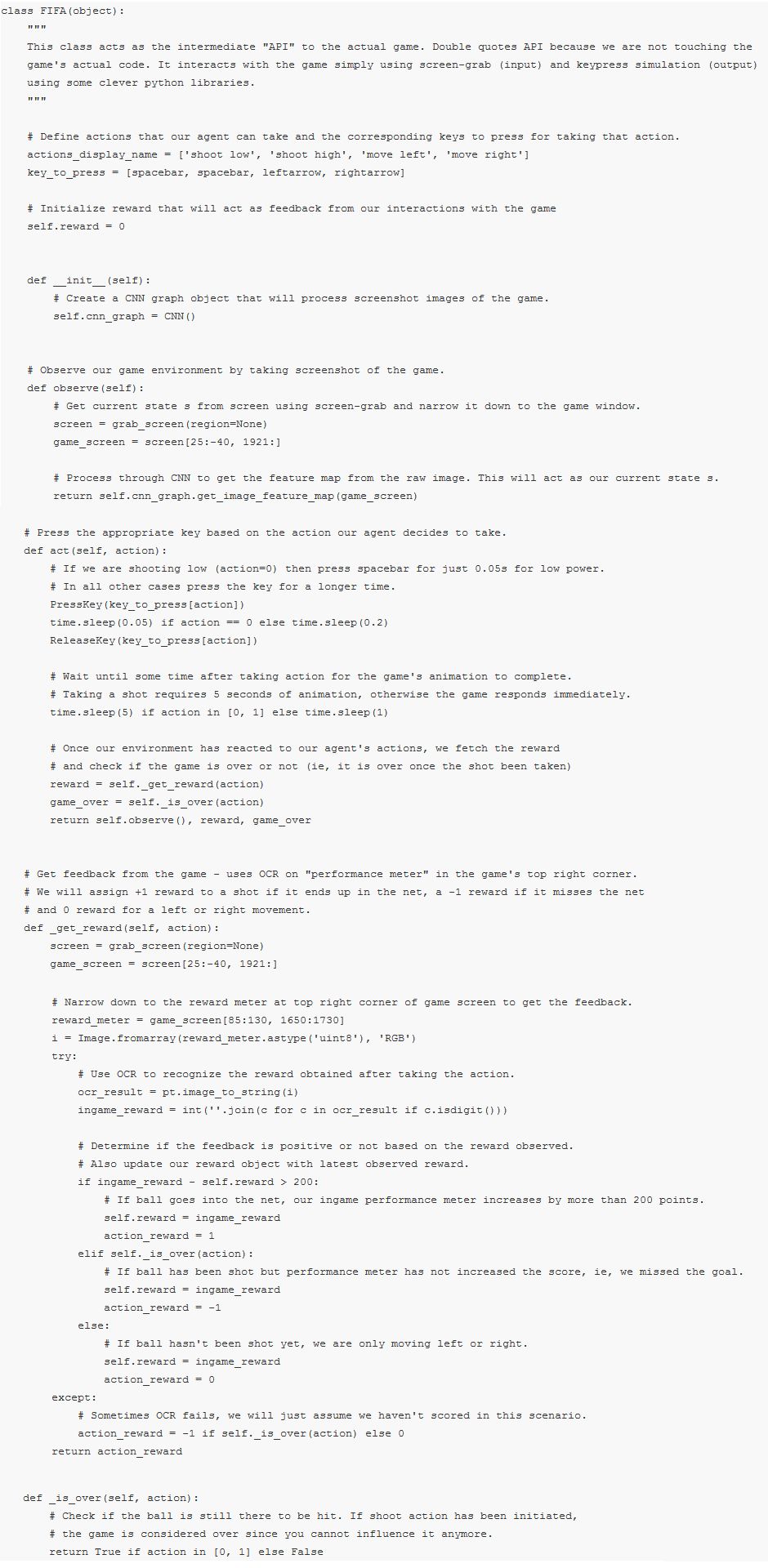 我们没有现成的 API 来访问代码。所以,我们自己制作 API!我们将使用游戏的截图来观察状态,利用模拟按键在游戏环境中采取动作,利用光学字符识别(OCR)来读取游戏中的奖励。我们的 FIFA 类别中有三种主要的方法:observe(), act(), _get_reward();另外还有一种方法是 _over(),检查任意球是否发出。