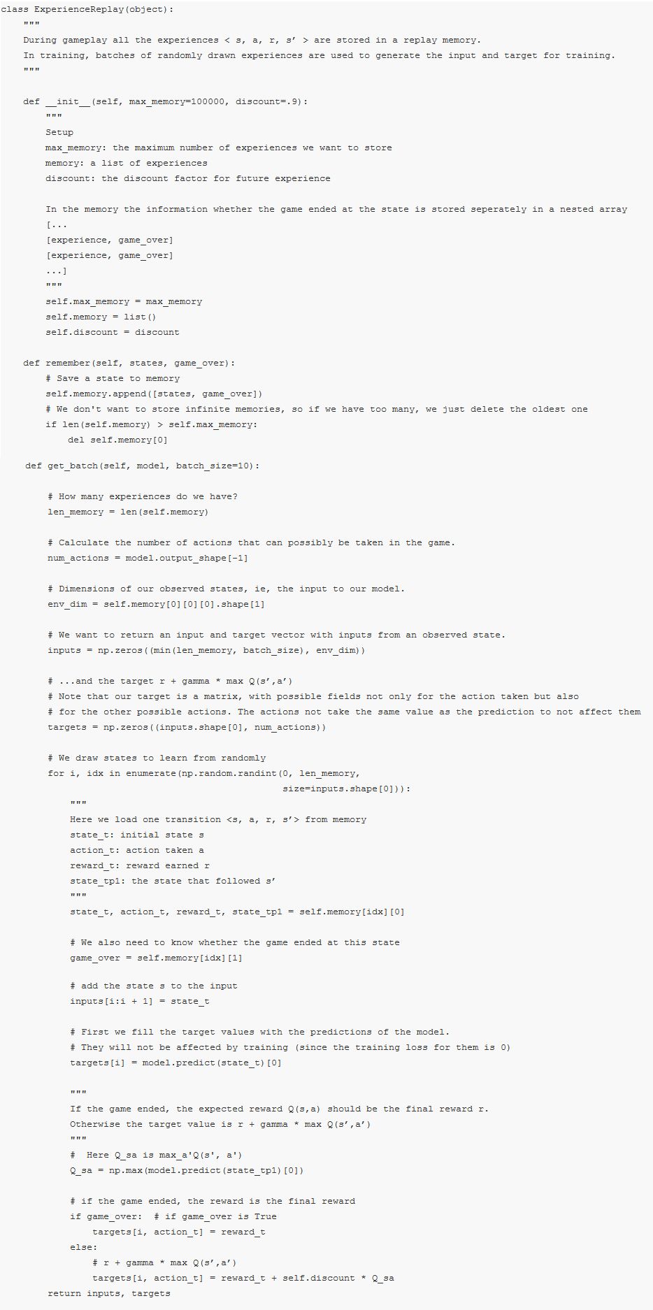在整个训练过程中,我们要储存所有的经验和观察到的奖励,并以此作为 Q 学习模型的训练数据。所以,对于我们采取的每一个动作,我们都要将经验 <s,>与 game_over 标志一起存储。我们的模型将尝试学习的目标标签是每个动作的最终奖励,这是该回归问题的实数。