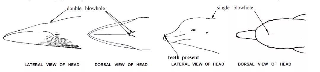 须鲸(左)齿鲸(右)示意图(改自 Marine mammal of the world 1st edition )