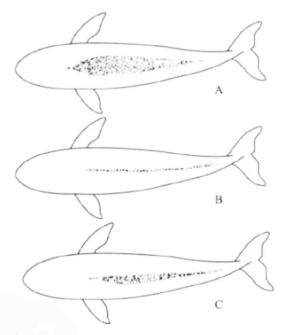 江豚背部棘状小结节分布特征——A.印太江豚(宽脊江豚) B.窄脊江豚长江亚种(长江江豚) C.窄脊江豚东亚亚种(改自王丕烈《中国鲸类》)