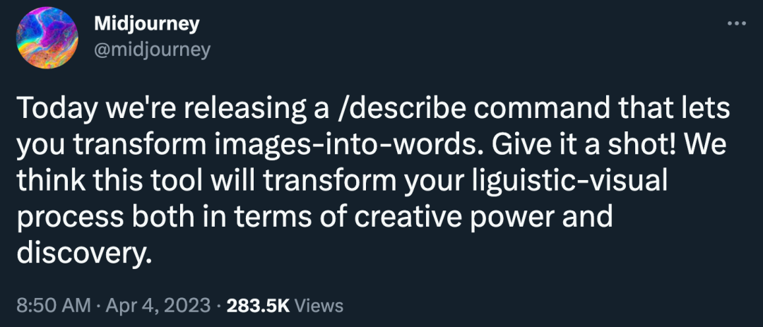 「今天,我们发布了一个 /describe 命令,可让您将图像转换为文字。」