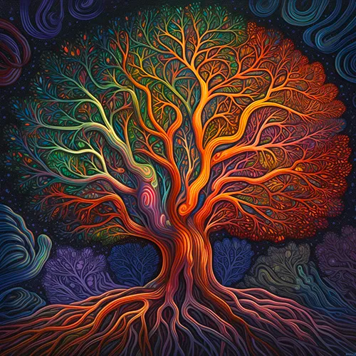 an illustration of a brain with tree roots, psychedelic art, vibrant, by Alex Grey, by Amanda Sage, by Robert Venosa, neon colors(一幅有树根的大脑图像,迷幻艺术,充满活力,作者 Alex Grey,作者 Amanda Sage,作者 Robert Venosa,霓虹颜色)