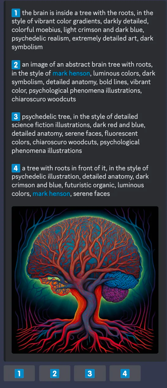 底部的四个数字是混合按钮,每个数字都与相应的描述相匹配。单击数字,Midjourney 会根据新的描述重新混合图像。
