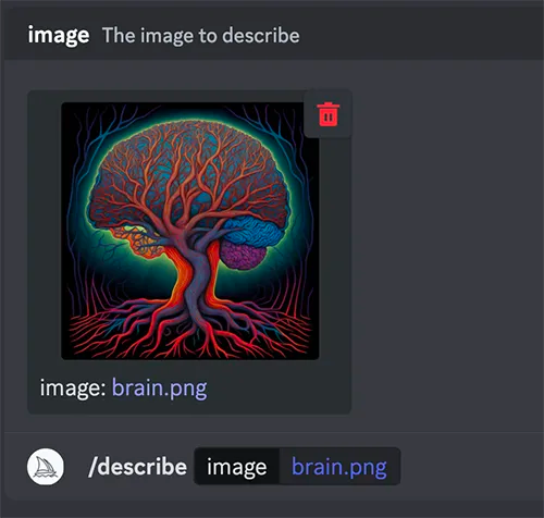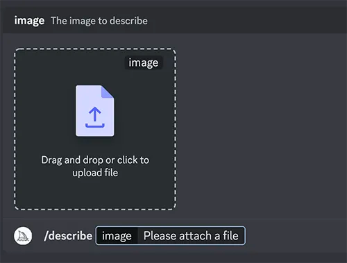 用户只需从写一个「 /describe」开始,Midjourney 提供了上传图像的位置: