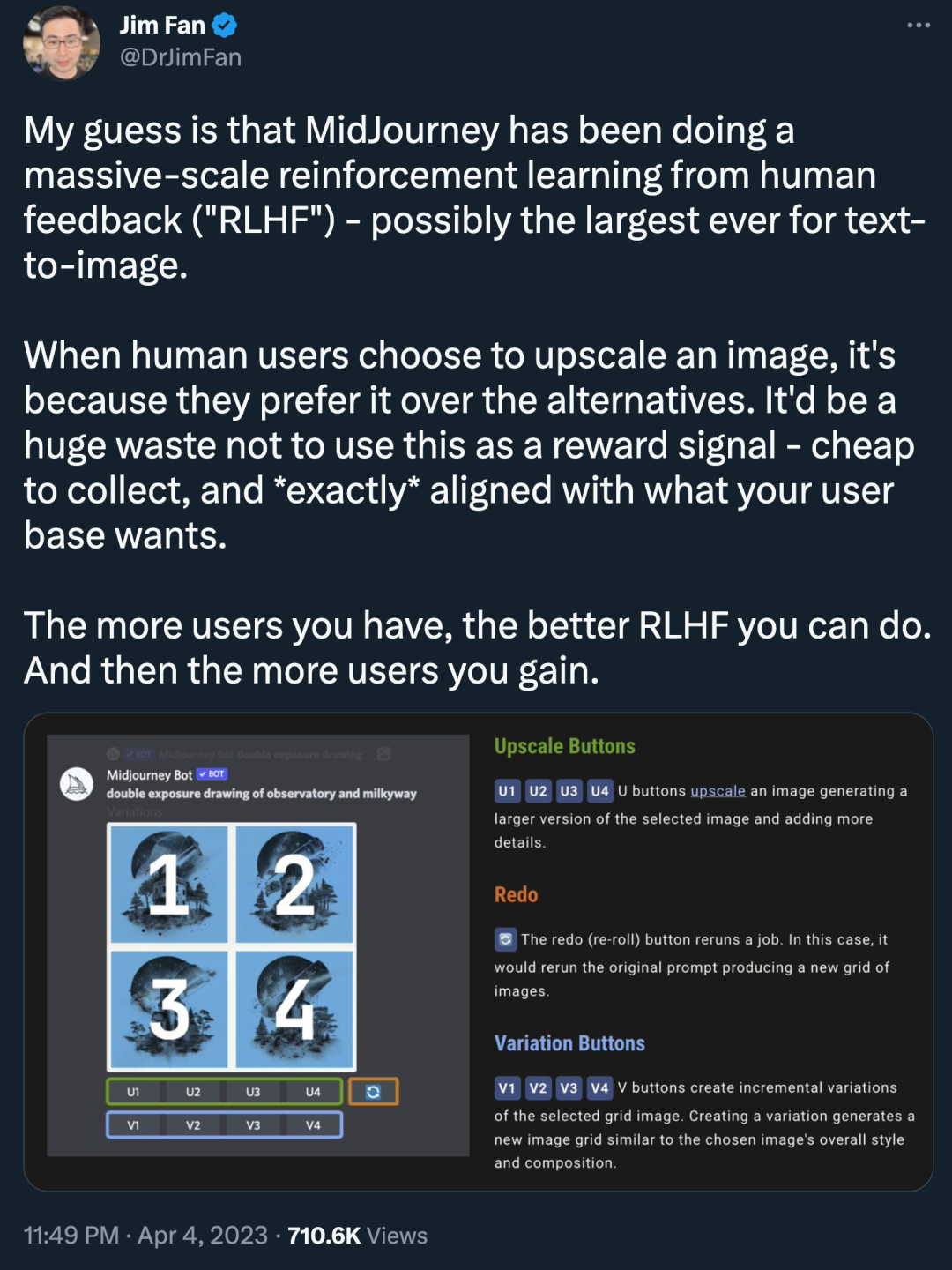 不管是「文生图」还是「图生文」,随着用户交互的增加,MidJourney 的效果必然会有所提升。有研究者猜测,MidJourney 一直在进行大规模的人类反馈强化学习(RLHF),而这可能是有史以来规模最大的文字转图像。拥有的用户越多,MidJourney 能做的 RLHF 就越好,然后获得的用户会变得更多。