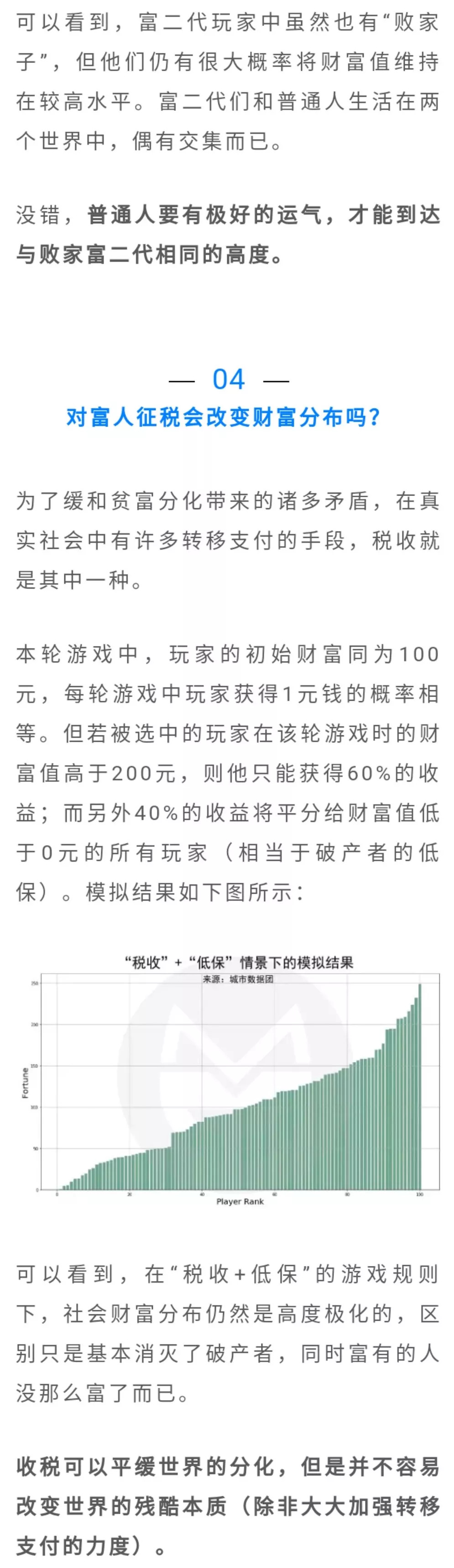 虽然这个分布形态与全是普通玩家的结果基本一致:top10和top20的富人掌握的社会财富比例和负债的人数比例都差不多,但是仔细来看,top5富人中的全部,以及top10富人中的7位都是富二代玩家。