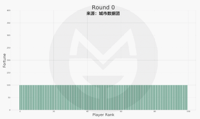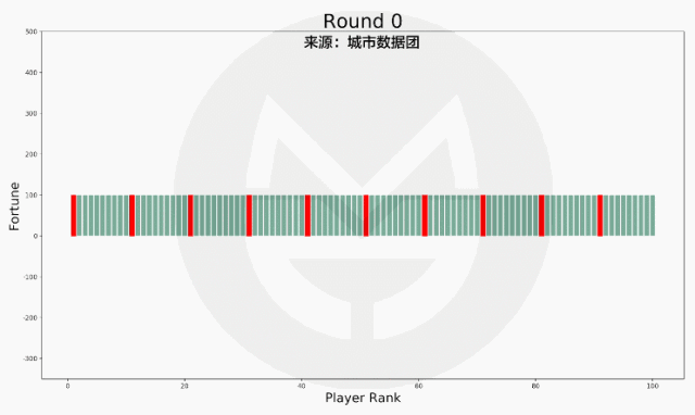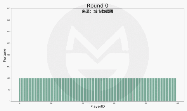 (说明:1.上图中横轴标签代表一个玩家的编号,柱子的高低变动反映该玩家财富值的变化。2. 当某人的财富值降到0元时,他在该轮无需拿出1元钱给别人,但仍然有机会得到别人给出的钱。)