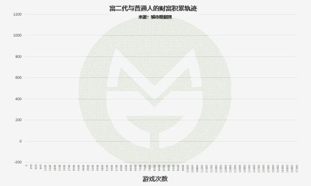 我们不妨把这场游戏视作社会财富分配的简化模型,从而模拟这个世界的运行规律。我们假设:每个人在18岁带着100元的初始资金开始玩游戏,每天玩一次,一直玩到65岁退休。“每天拿出一元钱”可理解为基本的日常消费,“获得财富的概率随机”是为了……嗯……简化模型。以此计算,人一生要玩17000次游戏,即获得17000次财富分配的机会。