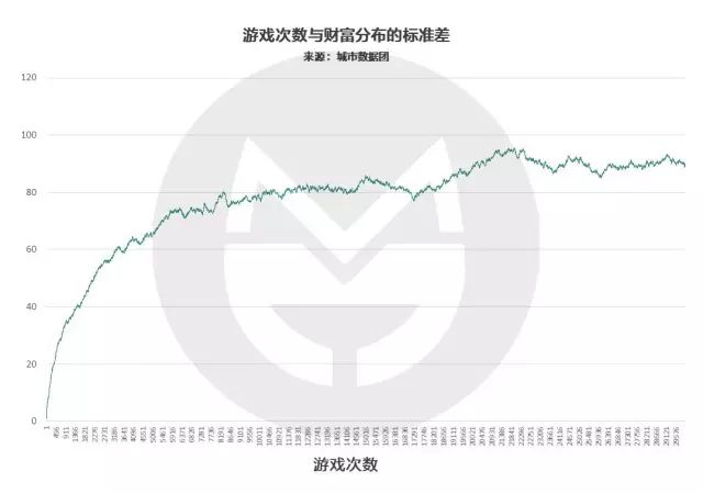 我们以所有玩家财富值的标准差来衡量社会贫富分化程度,按时间序列做出图来长这样: