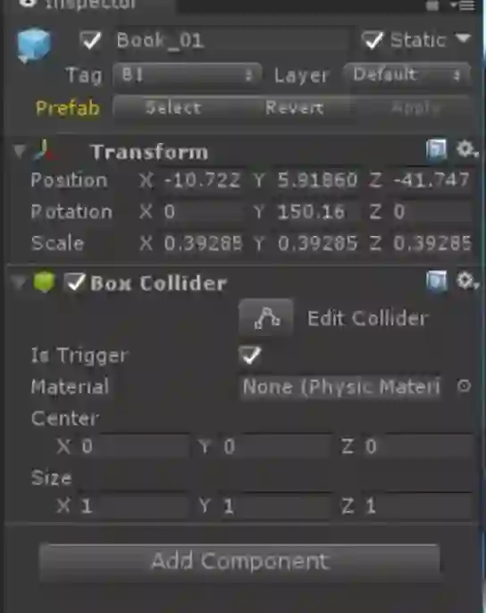 然后为了让它能够和玩家物体发生交互,我们将为它添加一个原型碰撞器。点击菜单Component——Physice——Box Collider 因为我们不希望玩家在收集它的时候突然撞上去然后停止运动,所以我们将它的碰撞器设置为触发模式,在组件中勾起Is Trigger。