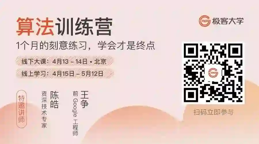 算法是比较难学的,即便如此,这其中还是有很多方法和路径可以遵循,一旦掌握了这些方法,学习起来就会事半功倍。为此,极客时间特邀“左耳朵耗子”陈皓、前 Google 工程师王争作为线下大课讲师,开设了为期一个月的算法训练营,通过 2 天线下 +4 周线上训练,帮助大家快速提升算法内功,掌握算法学习的高效方法,并在训练中让你学习到“算法”在工作和具体项目中到底该如何应用。