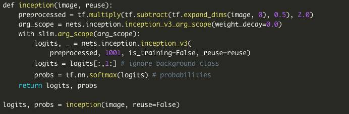 我们选择攻击在ImageNet数据集上训练的Inception v3网络。首先我们从TF-slim图像分类库中加载预先训练的网络。这部分不是很有趣,所以请随意跳过本部分。