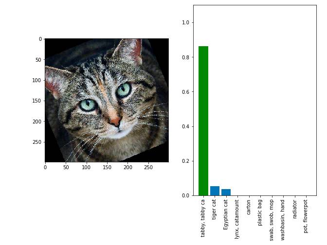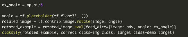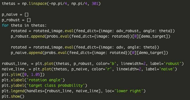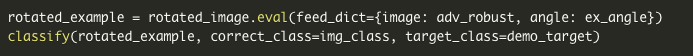 现在来看一个更高级的例子。遵循我们的方法来合成稳健的对抗样本,以找到对猫图像的单一扰动,这在某些选择的变换分布下同时对抗,可以选择任何可微分变换的分布;在这篇文章中,我们将合成一个单一的对抗输入,设置θ∈[- π/4,π/4],这对旋转是鲁棒的。