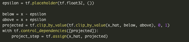 最后,编写投影步骤,使得对抗样本在视觉上与原始图像相似。另外,将其限定为[0,1]范围内保持有效的图像。