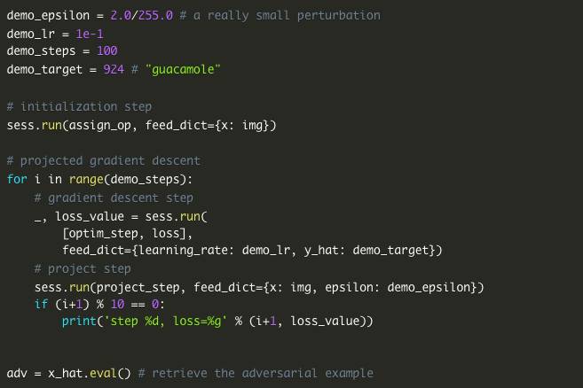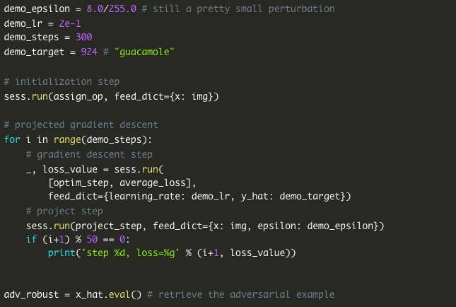 最后,我们准备运行PGD来产生对抗输入。和前面的例子一样,选择“鳄梨酱”作为我们的目标类。