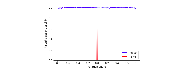 下面来看一下在整个角度范围内产生的鲁棒对抗样本的旋转不变性,看P(y'|x')在θ∈[- π/4,π/4]。