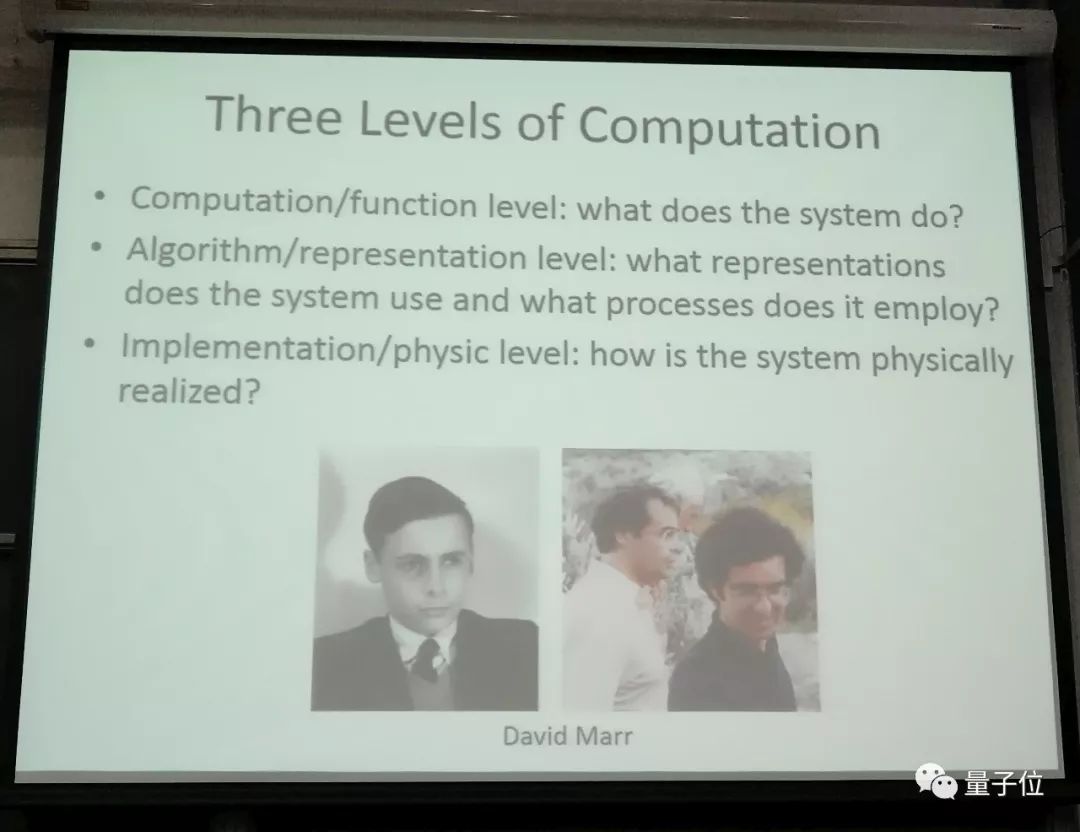 我再提一个概念,脑科学和计算视觉里面有一个先驱,David Marr,他说计算分三个层面,功能的层面,算法和表示的层面,还有实现和物理的层面。不同的层面,如果一个系统在做计算,在功能和物理的层面是不同的。给定一个输入,得到一个输出,这是功能,那么具体的算法可能不同的系统有不同的算法去实现同样的功能,在物理层面可能有不同的实现。