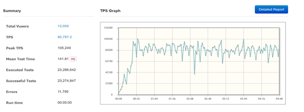 下图是生产环境压测效果,采用12000用户并发压测得到约8w TPS,平均响应时间为141ms,错误率在万分之五。