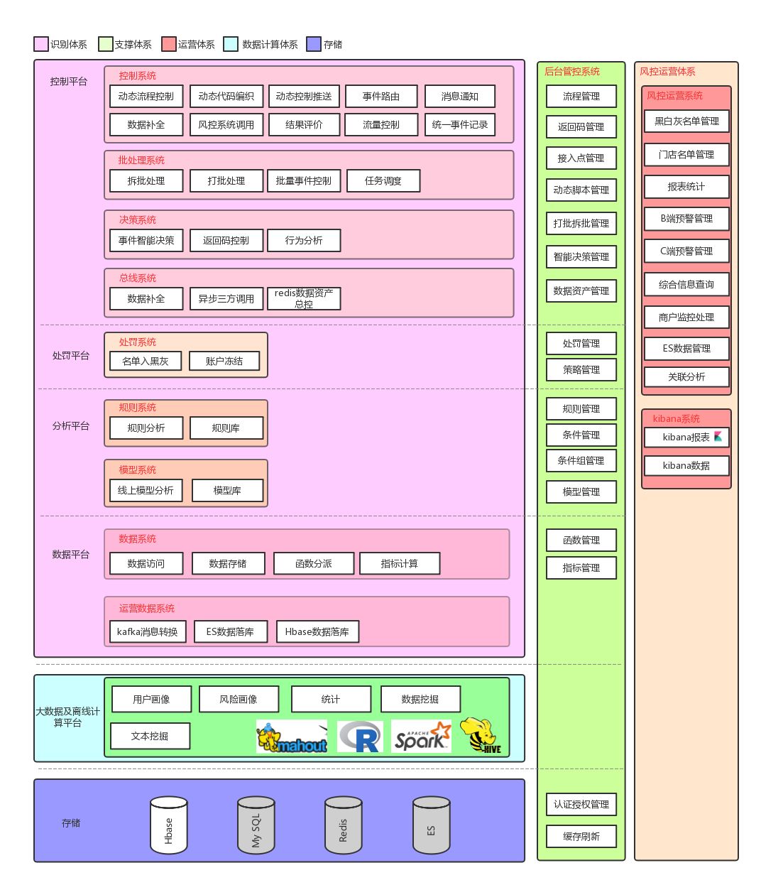 识别体系包括控制平台(控制系统,批处理系统,决策系统,总线系统),处罚平台(处罚系统),分析平台(规则系统,模型系统), 数据平台(数据系统,运营数据系统)。