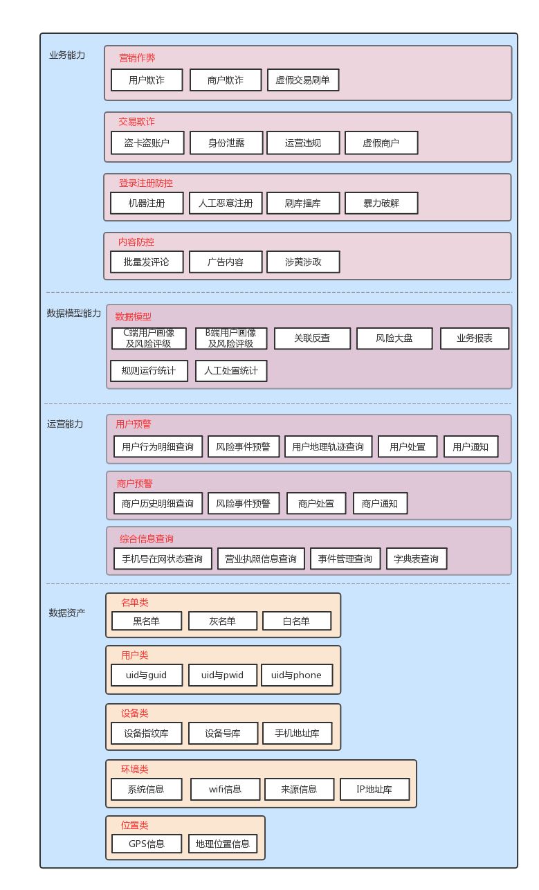 业务能力有,营销作弊,交易欺诈,登录注册防控,内容防控