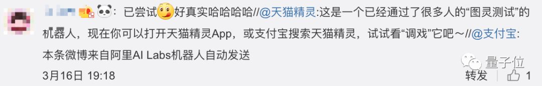 另外,阿里AI实验室旗下的“天猫精灵”还表示,这是一个已经通过了很多人的“图灵测试”的机器人,现在就可以打开天猫精灵App或支付宝搜索天猫精灵调戏“二哈”了。