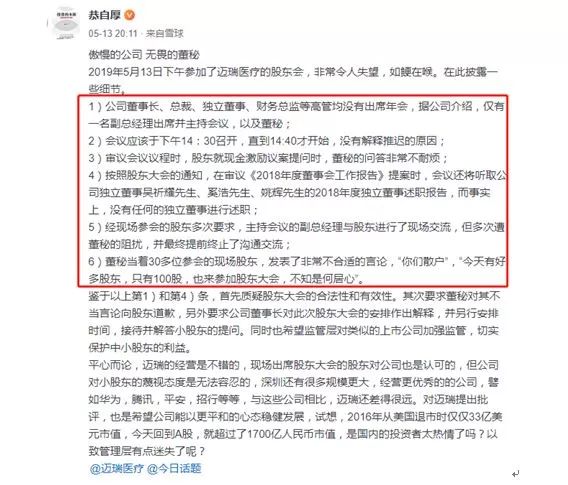 2019年5月13日晚间,有投资者在雪球平台发帖表示,5月13日下午参加了迈瑞医疗的股东会,非常令人失望,该投资者称,董秘当着30多位参会的现场股东,发表了非常不合适的言论,“你们散户”,“今天有好多股东,只有100股,也来参加股东大会,不知是何居心”。