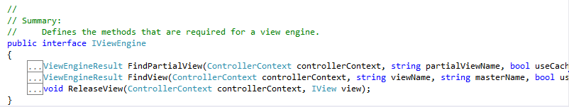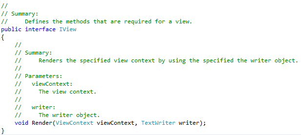 上面介绍了ViewEngine用来查找并获取相应IView对象,那IView是用来做什么的呢?下图是IView的接口定义,它只有一个Render方法,用来将指定的View上下文信息通过指定的TextWriter进行渲染,这实际上就是将View文件的内容处理后,写到Http响应数据的过程: