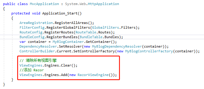 注:从上面的错误信息中可以看到ASP.NET MVC在查找View时,除了匹配了.cshtml和.vbhtml的文件外,还匹配了.aspx和.ascx的文件,后者是Web Form框架的页面文件,这是为什么呢?因为默认情况下ASP.NET MVC中会包含MVC使用的Razor 引擎和Web Form使用的Web Form引擎,所以在纯使用MVC开发的情况下,为了优化性能,一般会通过以下代码将Web Form的引擎删除: