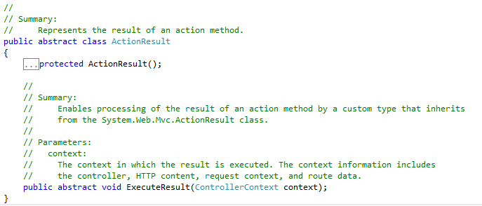 ActionResult的定义如下,它包含了一个名为ExecuteResult的方法,该方法用来完成对action方法执行结果进行处理: