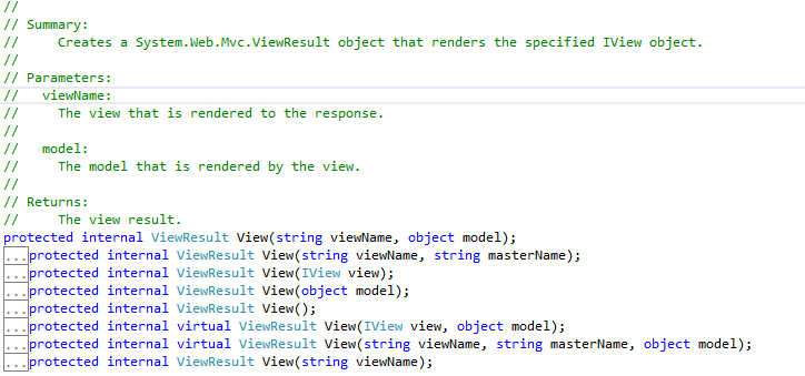 回到最初提到的View()方法,该方法定义在Controller中,它的返回值是一个ViewResult类型: