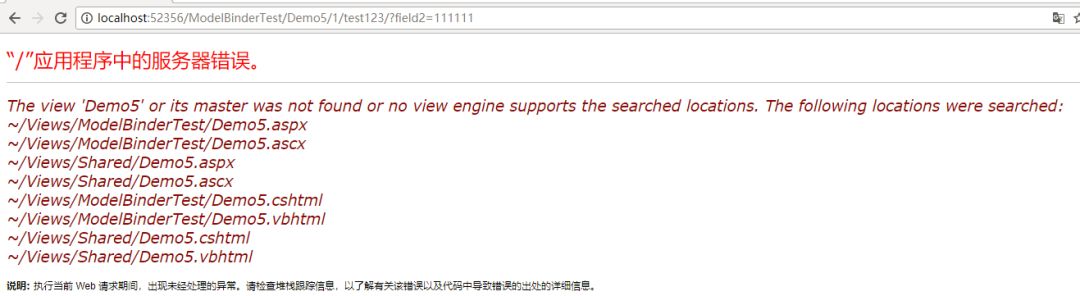 从代码可以看出它是通过一个ViewEngineCollection对象,根据ViewName(默认是actionName)去查找View的,如果找到返回一个ViewEngineResult类型,否则将抛出异常,异常中包含查找的位置: