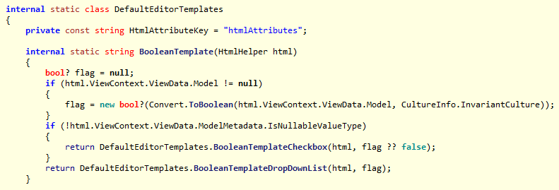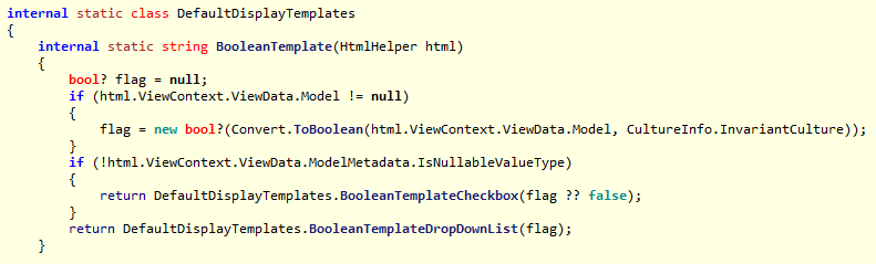 Display与Editor是根据模型的数据类型来判断如何对模型进行展示。ASP.NET MVC中为Display和Editor提供了一些基础类型的默认模板实现分别通过内部静态类型DefaultEditorTemplates和DefaultDisplayTemplates进行存储,下面是bool类型模板代码: