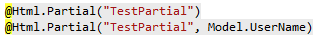 使用方法(注:第一个参数是Partial View的名称,默认情况下Partial View文件存储于Views/Shared目录下,如果文件不在这个目录下需要在参数中体现具体目录):