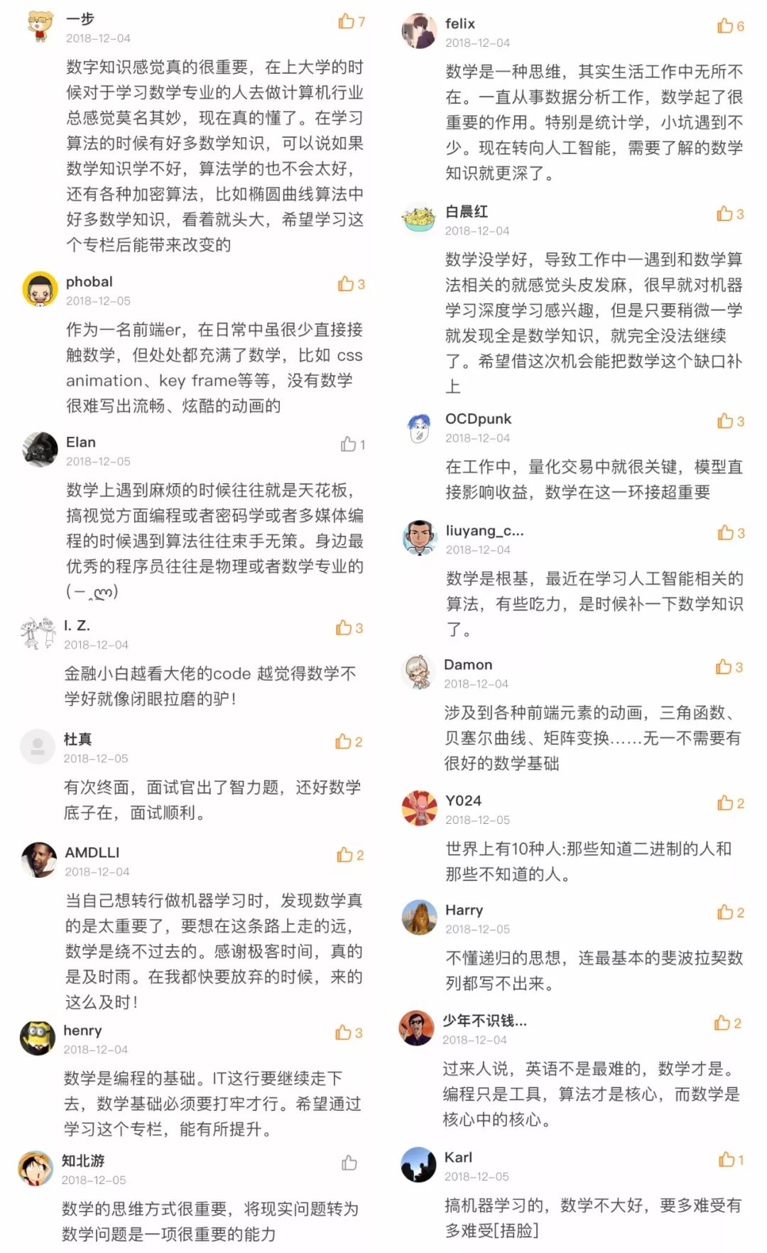 他的专栏《程序员的数学基础课》上线不过 5 个月,已经有超过 2W 人订阅了,截了点评价给你们作参考: