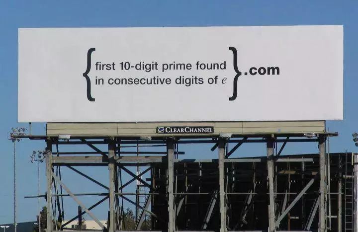 2004 年,在硅谷的交通动脉 101 公路上出现了一块巨大的广告牌,上面是道数学题:{ e 的连续数字中最先出现的 10 位质数 }.com。这里的 e 是数学常数,自然对数的底数,无限不循环小数。