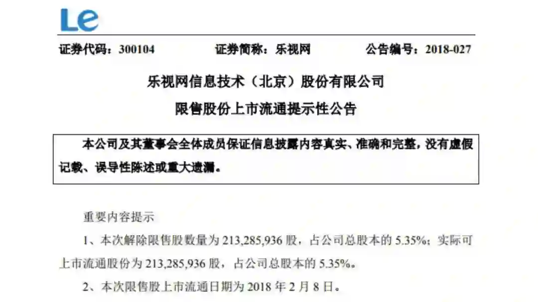 2 月 6 日,乐视网发布公告称,2 月 8 日公司有约 2.1 亿股限售股份将上市流通,占公司总股本的 5.35%。乐视网在公告中称,此将将上市流通的股份有 213,285,936 股。乐视网股价自 1 月 24 日复牌后,目前连续跌停,目前已经跌至 5 元价位。此前有机构称,由于受乐视体系资金链危机影响,乐视网股价会跌至 3.9 元左右。