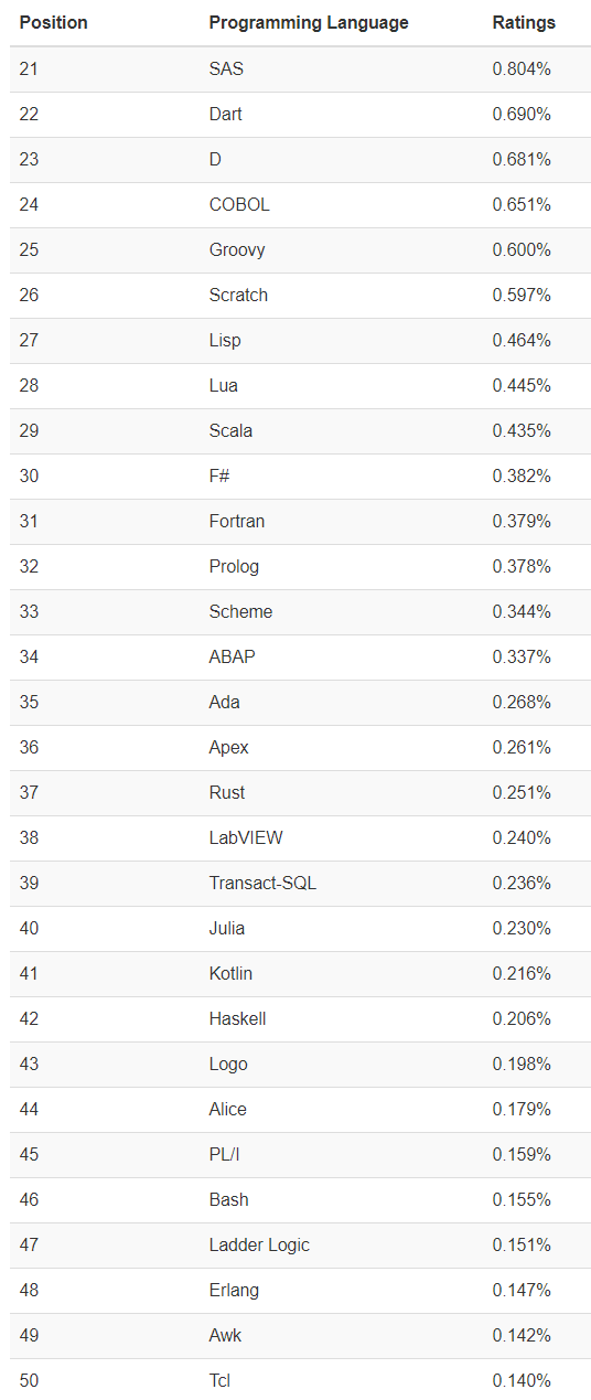 其他编程语言排名