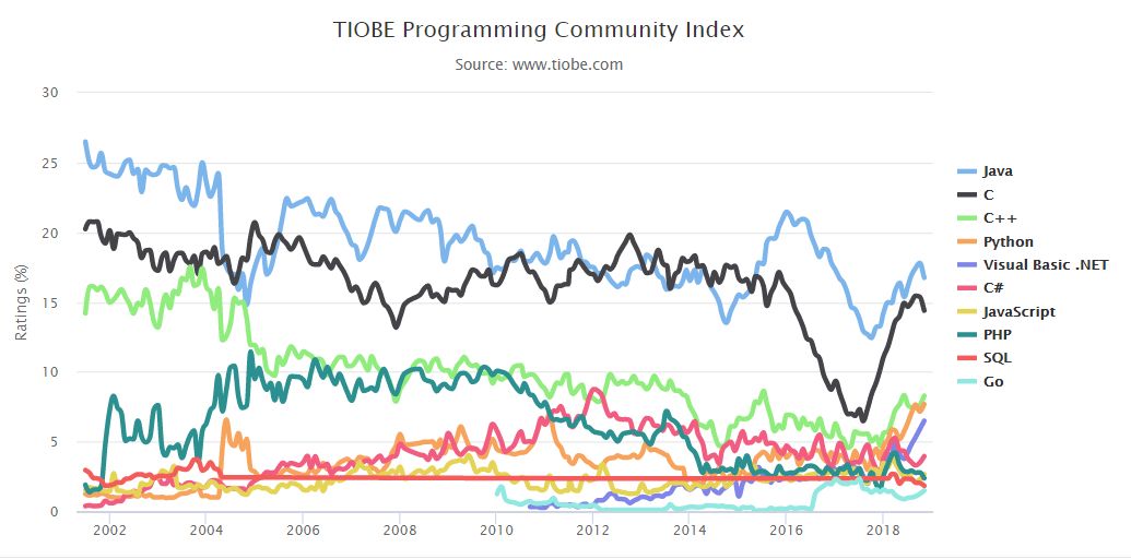 Top 10 编程语言 TIOBE 指数走势(2002-2018)