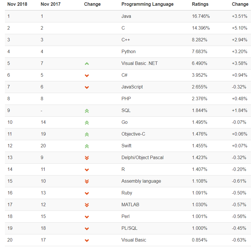 注意:SQL 自 2018 年 2 月起被重新添加到了 TIOBE 排行榜中,由于没有以往的数据可以对比,增长速度非常快,现在位居第 9 名。