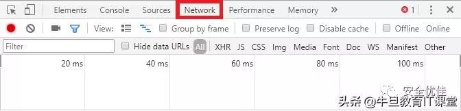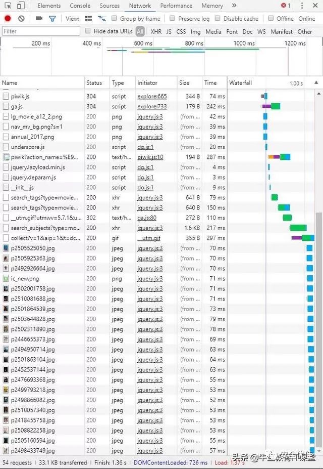 今天我们不再使用左上角的鼠标按钮了,而是使用红色框中的Network,这里显示的是网页加载出来的所有的文件,如下图所示: