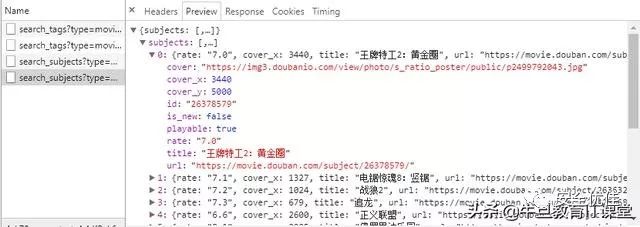 注释3:返回的content经过decode()方法解码,变成了一个字符串类型,根据我们前面的分析,得出这是一个JSON格式的字符串,因此,我们用Python内置的标准库json来进行解析,标准库就不需要用pip工具进行安装了。json模块有两个主要方法———json.loads()和json.dumps(),前一个是用来解码JSON数据的,后一个则是编码成JSON数据的。这里我们主要用到loads()方法,将content解析成一个字典格式的内容,存储在名为content_list的对象里,最后加上“[‘subjects’]”是用来解析出我们要的最简洁的部分,这个根据具体的内容来定,不是所有的解析都要这么写。比如这里,如下图: