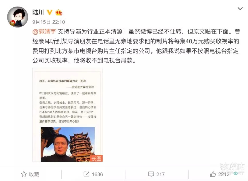 “支持郭靖宇导演为行业正本清源!虽然微博已经不让转,但原文贴在下面。曾经亲耳听到某导演朋友在电话里无奈地要求他的制片将每集40万元购买收视率的费用打到北方某市电视台购片主任指定的公司。他跟我说如果不按照电视台指定公司买收视率,他将收不到电视台尾款。”