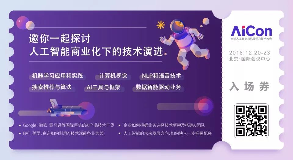 推荐一个年末不可错过的 AI 技术大会,学习来自 Google、微软、亚马逊、BAT、京东、美团、华为等 40+ 人工智能落地案例干货总结,大会日程已新鲜出炉,点击“阅读原文”即可查看。大会开幕倒计时 10 天,门票即将售罄,欲购从速~~