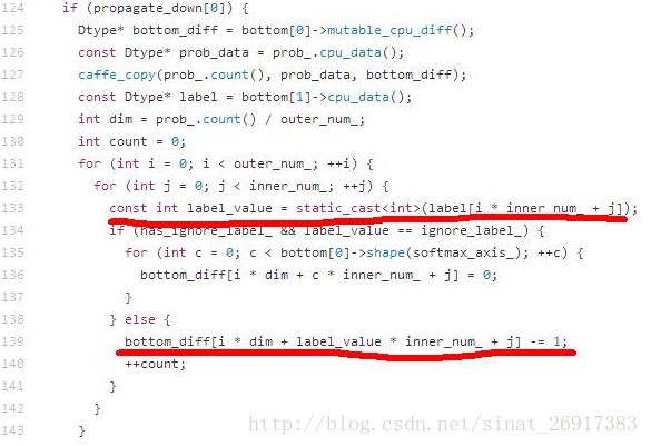 132行第一层for循环中的outer_num等于batch size,对于人脸识别和图像分类等单标签分类任务而言,inner_num等于1。如果label从1开始,会导致bottom_diff数组访问越界。